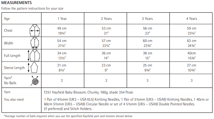 This Hayfield Baby Blossom Chunky Flower Show Sweater 5573 is perfect for your next project and requires 2 - 3 balls of yarn to complete. It would suit an Intermediate Knitter.